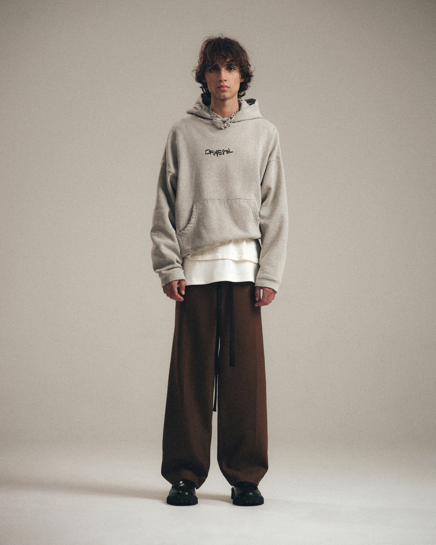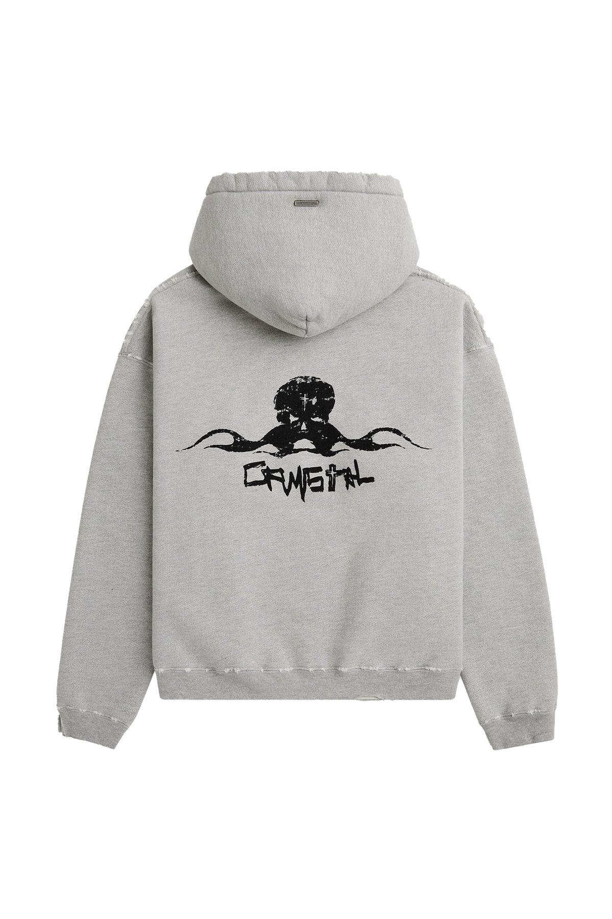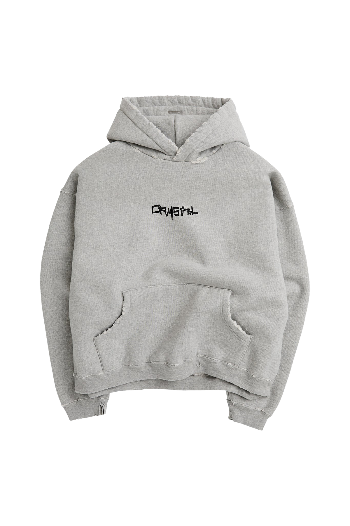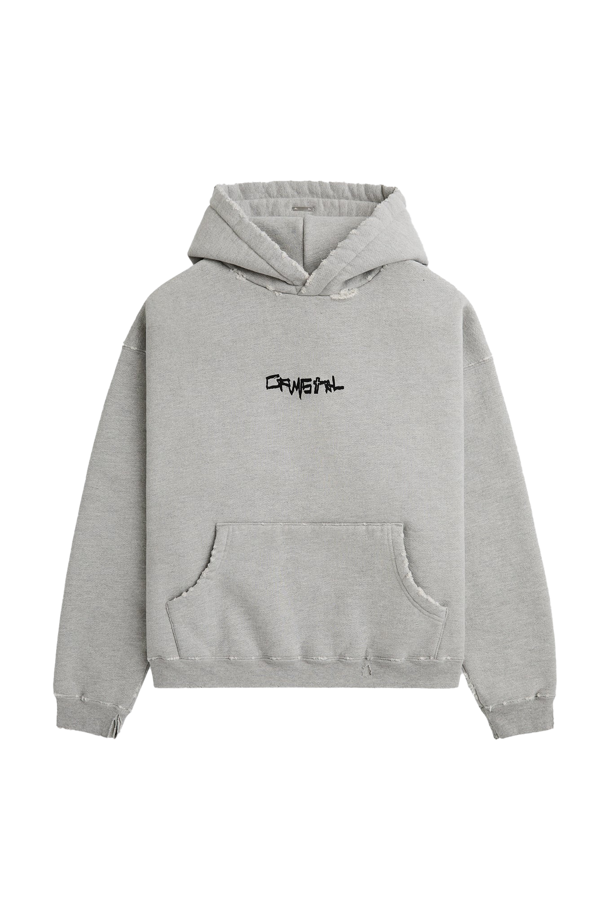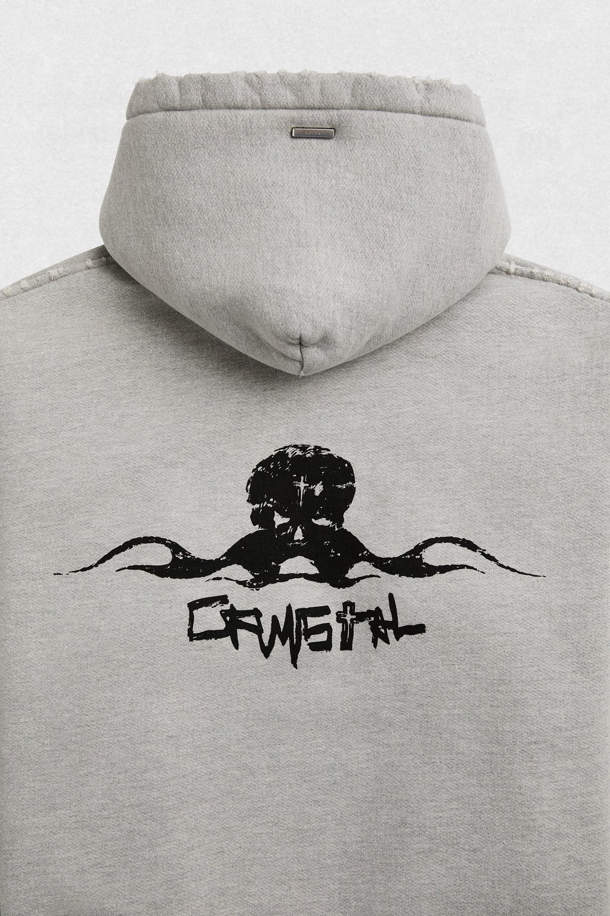 Distressed heather grey cropped hoodie with dropped shoulder featuring Crystal artwork
